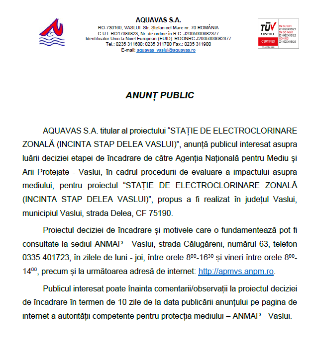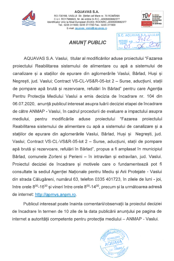 Proiectul regional de dezvoltare a infrastructurii de apă și apă uzată din județul Vaslui în perioada 2014-2020