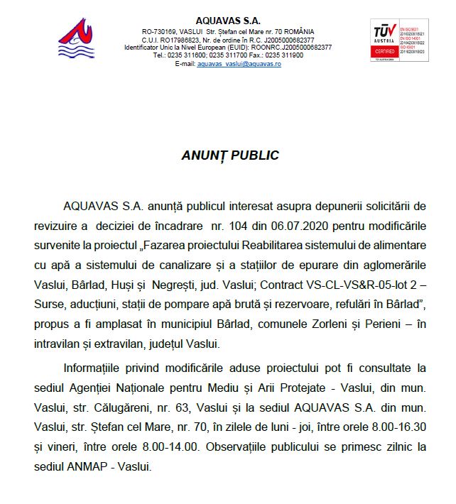 Proiectul regional de dezvoltare a infrastructurii de apă și apă uzată din județul Vaslui în perioada 2014-2020